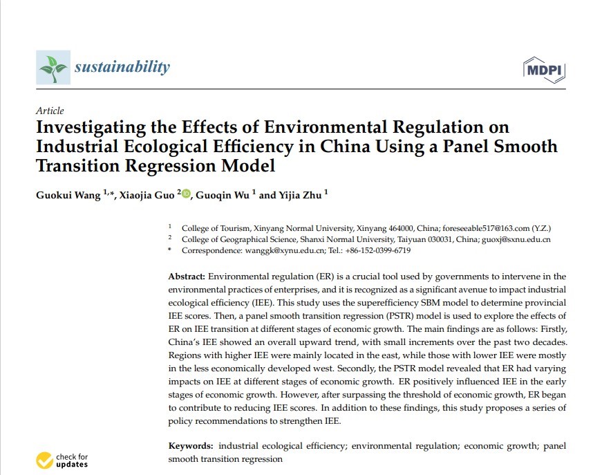 beat365亚洲体育官方网站王国奎博士在SSCI期刊《sustainability》上发表题为“Investigating the Effects of Environmental Regulation on Industrial Ecological Efficiency in China Using a Panel Smooth Transition Regression Model”的学术论文。