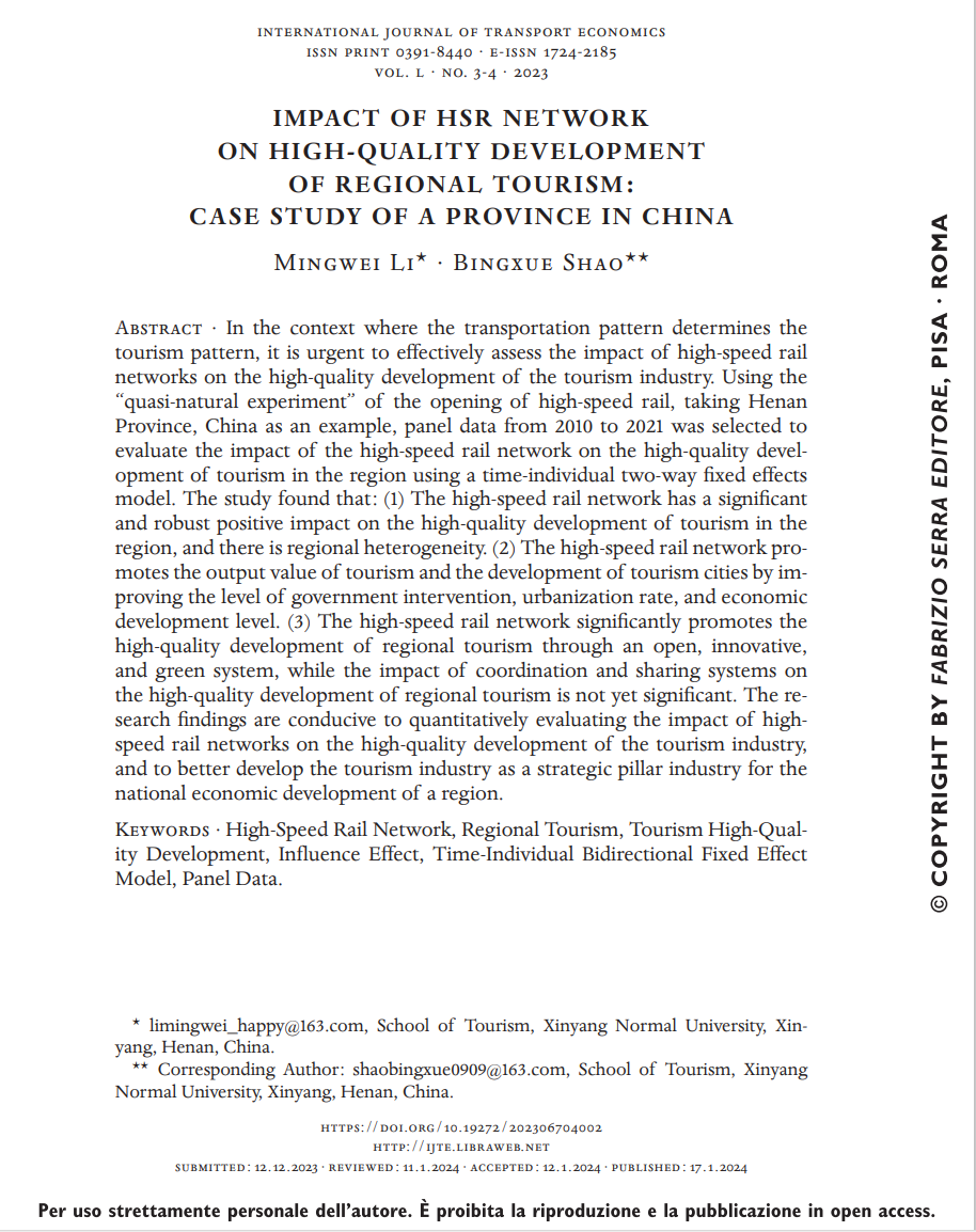 近日,beat365亚洲体育官方网站李明伟博士在SSCI期刊《International Journal of Transport Economics》发表题为“Impact of HSR Network on High-Quality Development of Regional Tourism: Case Study of a Province in China”(DOI: 10.19272/202306704002)的学术论文。