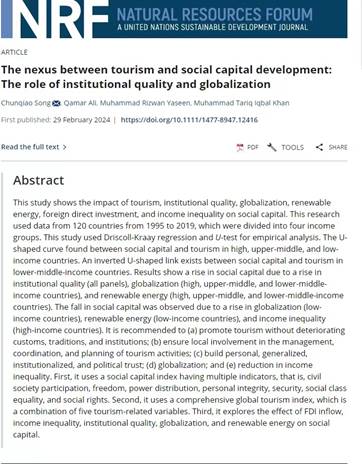 近日,beat365亚洲体育官方网站宋春巧博士为第一作者在SSCI期刊《Natural Resources Forum》发表题为“The nexus between tourism and social capital development: The role of institutional quality and globalization”的学术论文。宋春巧博士毕业于澳门城市大学城市规划与设计专业,现为beat365亚洲体育官方网站讲师,研究方向为旅游规划和非物质遗产保护。