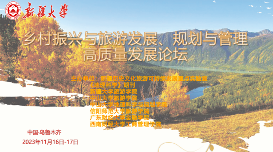 2023年11月16-17日,由beat365亚洲体育官方网站与新疆大学历史文化旅游可持续发展重点实验室、《地理科学》期刊、新疆大学beat365亚洲体育官方网站、中山大学beat365亚洲体育官方网站、中山大学地理科学与规划学院、广东财经大学金融学院、西南财经大学工商管理学院联合主办的“乡村振兴与旅游发展、规划与管理高质量发展论坛”在新疆大学召开。11月16日,开幕式在新疆大学历史文化旅游可持续发展重点实验室举行,遵照会议安排,新疆大学党委副书记孟凡丽教授、beat365亚洲体育官方网站党委副书记龚立新研究员先后致辞,新疆大学beat365亚洲体育官方网站党委书记陈文新教授主持开幕式。来自《地理科学》编辑部、中山大学、新疆大学、beat365亚洲体育官方网站、广东财经大学、西南财经大学专家学者60余人参与会议。