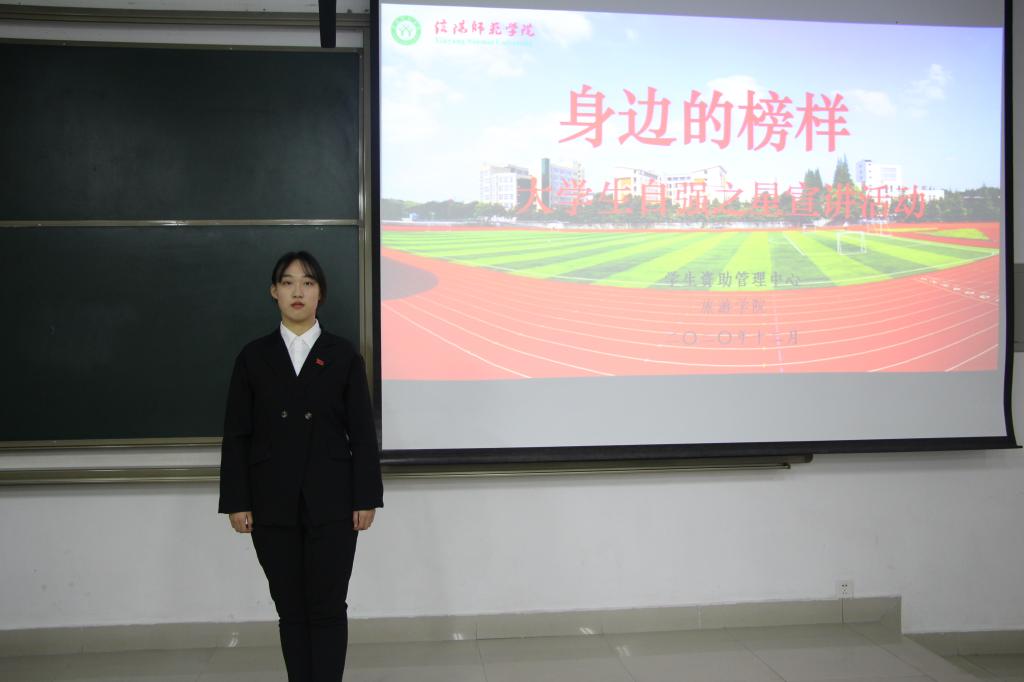 活动伊始,首先是来自体育学院的王梦卓为大家讲述《青春由磨砺而出彩,人生因奋斗而升华》,她学习成绩优秀,连续两年学习成绩与综测成绩位居班级第一,积极参加活动,并获取多张证书。青年要始终秉持决战决胜的姿态,不负期望,不负嘱托,奋斗前行,让青春光芒照耀新时代。其次是数学与统计学院贾晴岚为大家带来《心中所信,必将远行》面向未来,走好新时代的长征路,我们更需要坚定理想信念,矢志拼搏奋斗。最后由音乐与舞蹈学院许美佳为大家带来《奋发进取,向阳而生》她创立了舞蹈机构,而且有自己独立的经济能力,敢于吃苦,不畏艰难,不断突破,做常人所不敢做之事。