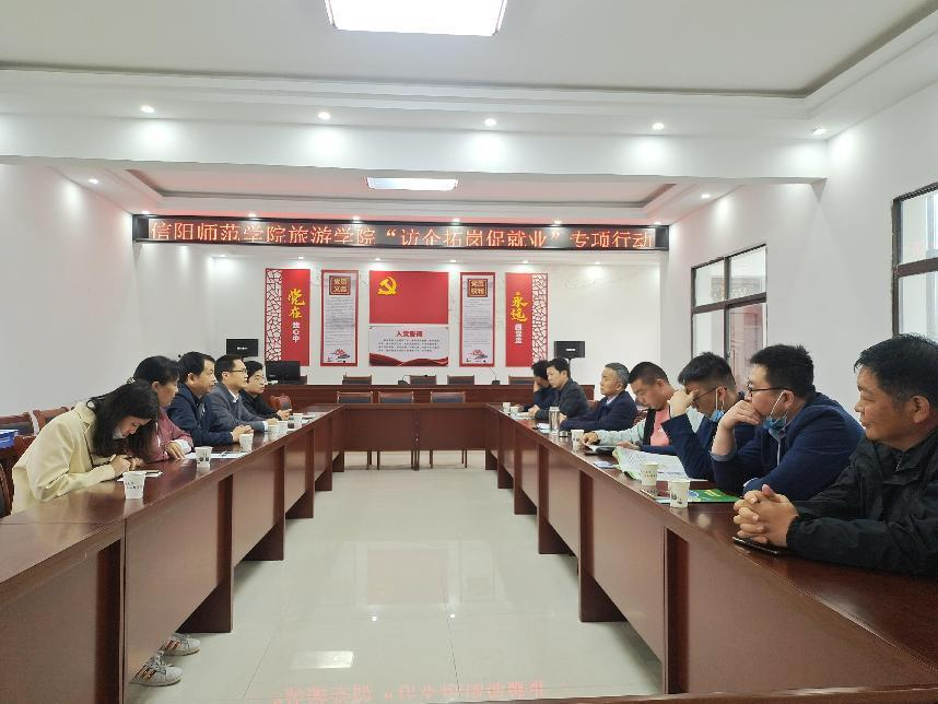 为深入贯彻落实2022届全国普通高校毕业生就业创业工作网络视频会精神,积极响应《教育部办公厅关于开展全国高校书记校长访企拓岗促就业专项行动》的要求,5月12日上午,beat365亚洲体育官方网站党委书记雷前龙、院长高军波带领领导班子成员、就业工作秘书和学生代表一行走访了信阳吉小象旅游开发有限公司、河南宿描、嘉木饮等文旅融合企业,积极为2022届毕业生寻找就业岗位,寻求高校与地方对接的有效途径,取得了显著的成效。浉河区文化广电和旅游局党委书记范振清、副局长朱启宝德和企业代表参加了此次调研。