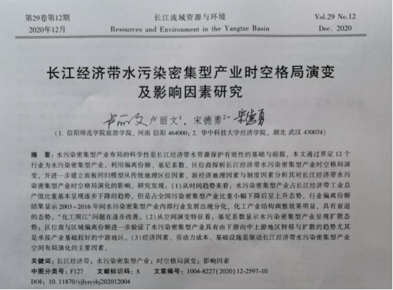 近日,beat365亚洲体育官方网站卢丽文博士在CSSCI期刊《长江流域资源与环境》上发表题为“长江经济带水污染密集型产业时空格局演变及影响因素研究”的学术论文。