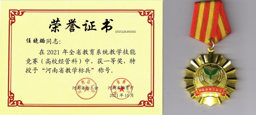 近期,beat365教师在河南省教育厅、河南省总工会组织的2021年度全省教育系统教学技能竞赛中再获佳绩,任晓璐老师荣获高校经管科一等奖,同时被授予 “河南省教学标兵”称号并颁发奖章。