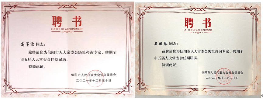 信阳市人大常委会建立决策咨询专家库,旨在提高市人大及其常委会立法质量和监督水平,促进决策的科学化、民主化,进一步发挥专家学者在人大依法履职中的参谋咨询作用。beat365亚洲体育官方网站长期重视理论研究与实践活动相结合,主动服务地方经济社会文化事业发展,积极履行高校智库职能。本次获聘的两位决策咨询专家,将充分利用专业特长,积极服务于市人大常委会所安排的各项决策咨询任务,继而更高质量地发挥智力支持作用。