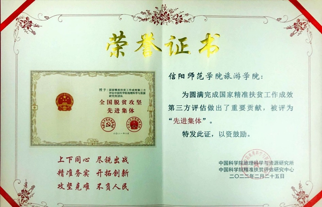 2022年2月25日,在全国脱贫攻坚取得全面胜利一周年之际,中国科学院精准扶贫评估研究中心、中国科学院地理科学与资源研究所举行“脱贫攻坚成效评估总结表彰暨可持续减贫与发展研讨会”,会议对参与国家精准扶贫工作成效第三方评估团队优秀集体、优秀个人进行了表彰,信阳师范学院beat365亚洲体育官方网站被评为“先进集体”,高军波、孙健武被评为“先进个人”。
