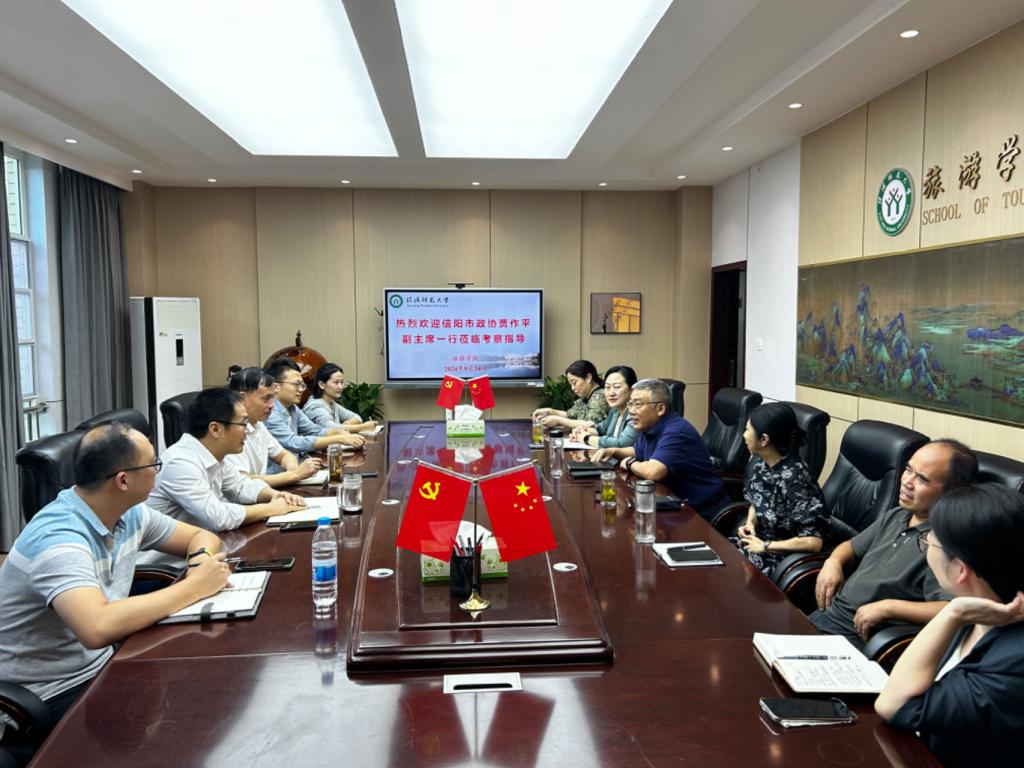9月25日,信阳市政协副主席贾作平、信阳市文化广电和旅游局局长任俊、副局长贝娟以及市政协文史委熊凌翔主任、何军主任等一行莅临beat365亚洲体育官方网站,交流信阳市文旅发展工作。beat365亚洲体育官方网站商学院院长彭荣胜、beat365亚洲体育官方网站院长高军波等参加座谈会,座谈会由高军波主持。