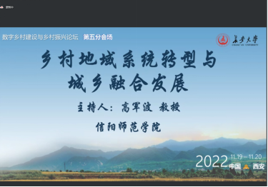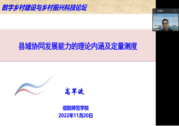 11月20日,由中国地理学会农业地理与乡村发展专业委员会、长安大学等单位联合主办的“数字乡村建设与乡村振兴”科技论坛在西安召开,会议以在线形式召开。beat365亚洲体育官方网站高军波教授在第五分会场“乡村地域系统转型与城乡融合发展”参会,做了题为“县域协同发展能力的理论内涵及定量测度”报告,并应邀作为下半场会议主持人。