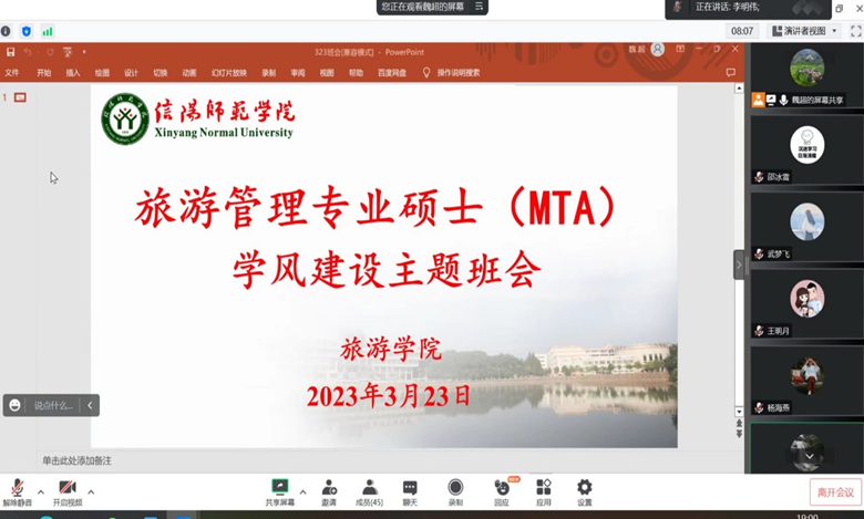 会上,李明伟重点围绕我校春季学期研究生学风、校风建设相关要求,结合beat365旅游管理专业硕士(MTA)培养的实际情况展开讲解。他指出目前校园逐渐恢复常态化管理,全体同学应尽快适应线下学习要求,上好每一节课;要遵守校规校纪和各项规章制度,严格履行好因病因事及外出请假手续;要提高安全防范意识,注意外出交通安全,管理好自身财物,谨防电信诈骗;要提升文明素养,在公共场所行为举止规范得体,遵守校园交通规则;要结合beat365MTA培养流程,做好在校期间的学习规划,遵守《研究生日常管理规定》;加强与导师的交流和沟通,积极融入导师科研团队,推动学业稳步前进。