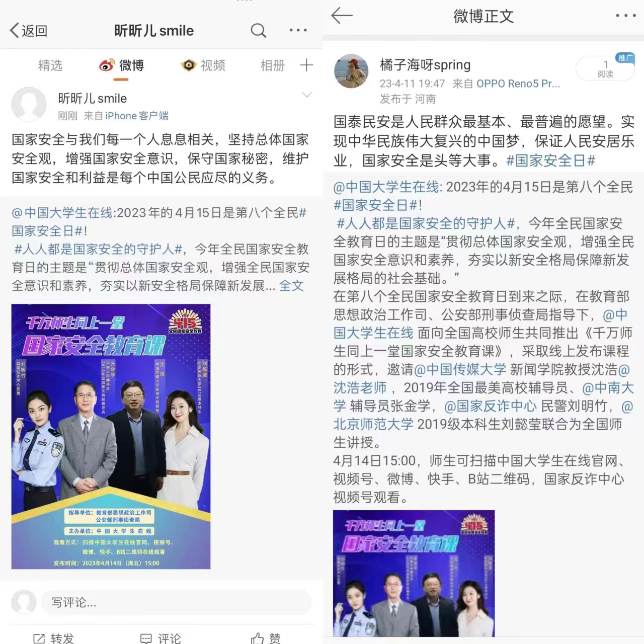 一、“微博话题”互动,营造国家安全教育氛围。广泛动员研究生参加“国家安全教育主题短视频线上接力活动”“微博#国家安全日#话题”互动,并@中国大学生在线@微信高校参与话题接力活动。同学们在微博、朋友圈等多个平台参与#国家安全日#话题互动并发表自己的感想,营造了国家安全教育浓厚氛围。